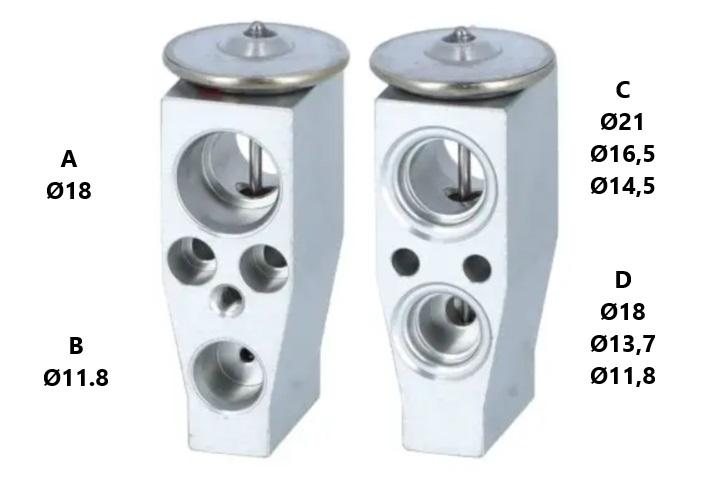 TIPO DE VALVULA: MONOBLOCK MEDIDA Ø A: 18 MEDIDA Ø B: 11,8 MEDIDA Ø C: 21//16,5//14,5 MEDIDA Ø D: 18//13,7//11,8 Aplicación: SEAT, AUDI, VW, SKODA, CUPRA, MAN