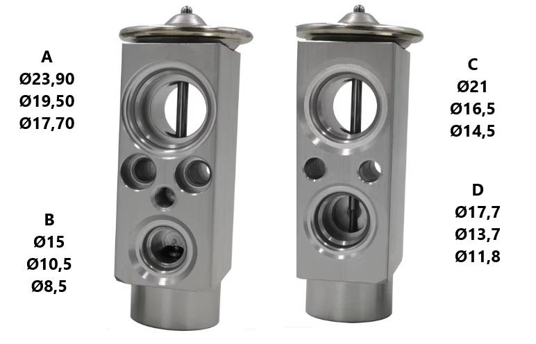 TIPO DE VALVULA: MONOBLOCK MEDIDA Ø A: 23,90//19,50//17,70 MEDIDA Ø B: 15//10,5//8,5 MEDIDA Ø C: 21//16,5//14,5 MEDIDA Ø D: 17,7//13,7//11,8 Aplicación: MERCEDES, PORSCHE, VOLVO, MINI, VW, BMW, RENAULT, OPEL