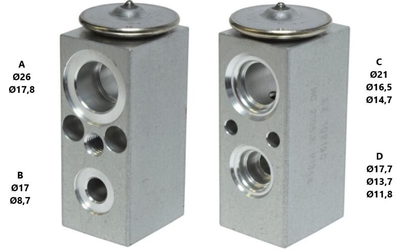 TIPO DE VALVULA: MONOBLOCK MEDIDA Ø A: 26//17,8 MEDIDA Ø B: 17//8,7 MEDIDA Ø C: 21//16,5//14,7 MEDIDA Ø D: 17,7//13,7//11,8 Aplicación: JEEP, CHRYSLER